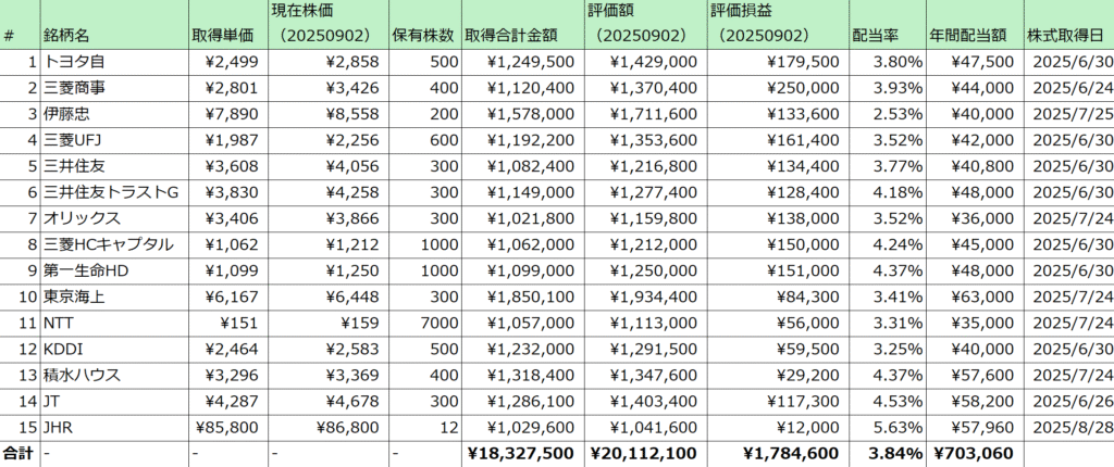 2025年6月末から集中的に日本高配当株を購入し始め、2025年9月2日時点で保有銘柄は合計15銘柄、評価額は2,000万円強となっています。購入タイミングにも恵まれたこともあり、現時点での評価損益は+178万円、利回りも10%弱と非常に好調な状況です。