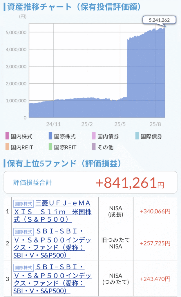 2025年5月から新NISAで本格的に投資を開始した結果、約3カ月で+84万円の含み益となりました。