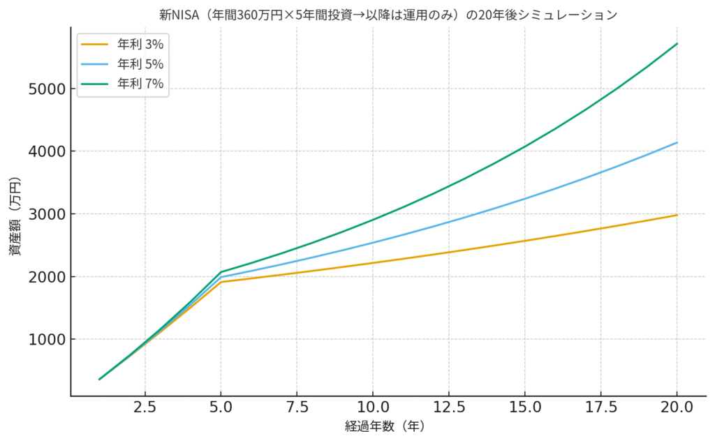 下記のグラフは「毎年360万円を5年間(2025〜2029年初まで)投資し、以降は追加投資なしで運用だけ続けた場合」の20年後のシミュレーションです。